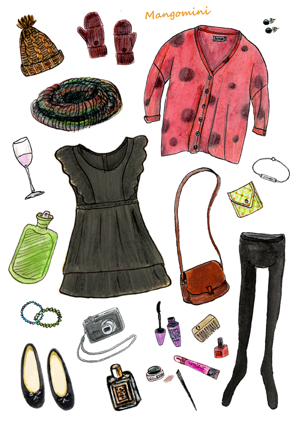 Hat and scarf, Newyorker – mittens, C&A – cardigan and dress, Nümph – bag, vintage – small purse, Solmode – shoes, H&M.