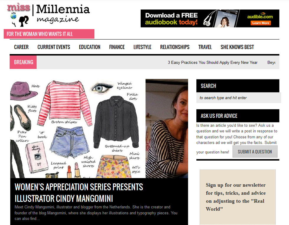 Miss Millennia Magazine This month I’m featured on Miss Millenia’s “Women’s appreciation” series. Click here to read the whole article. Share this: Click to share on Facebook (Opens in new window) Facebook Click to share on X (Opens in new window) X Click to share on Pinterest (Opens in new window) Pinterest Click to share on Tumblr (Opens in new window) Tumblr Like Loading... Related