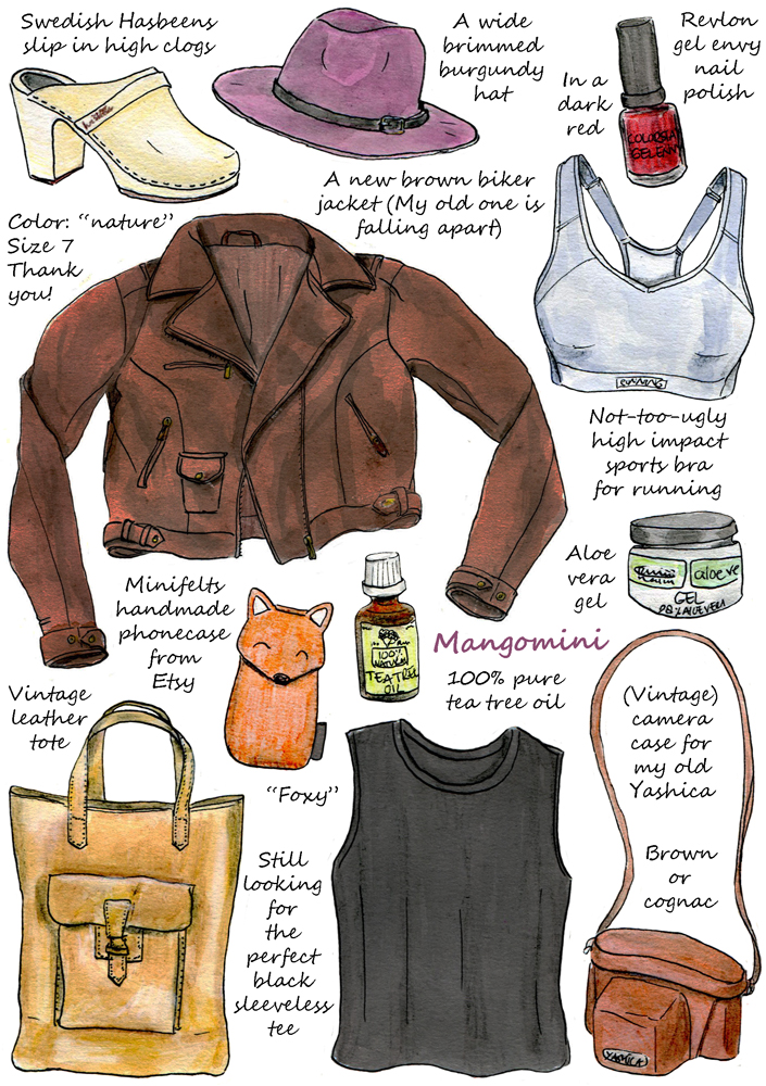 I love making lists, especially “action plans” and wish-lists. As an illustrator, I live on a small budget. I find that making a wish-list every season helps me make better shopping decisions. I hardly ever buy anything on impulse. This is my end-of-summer-wish-list.