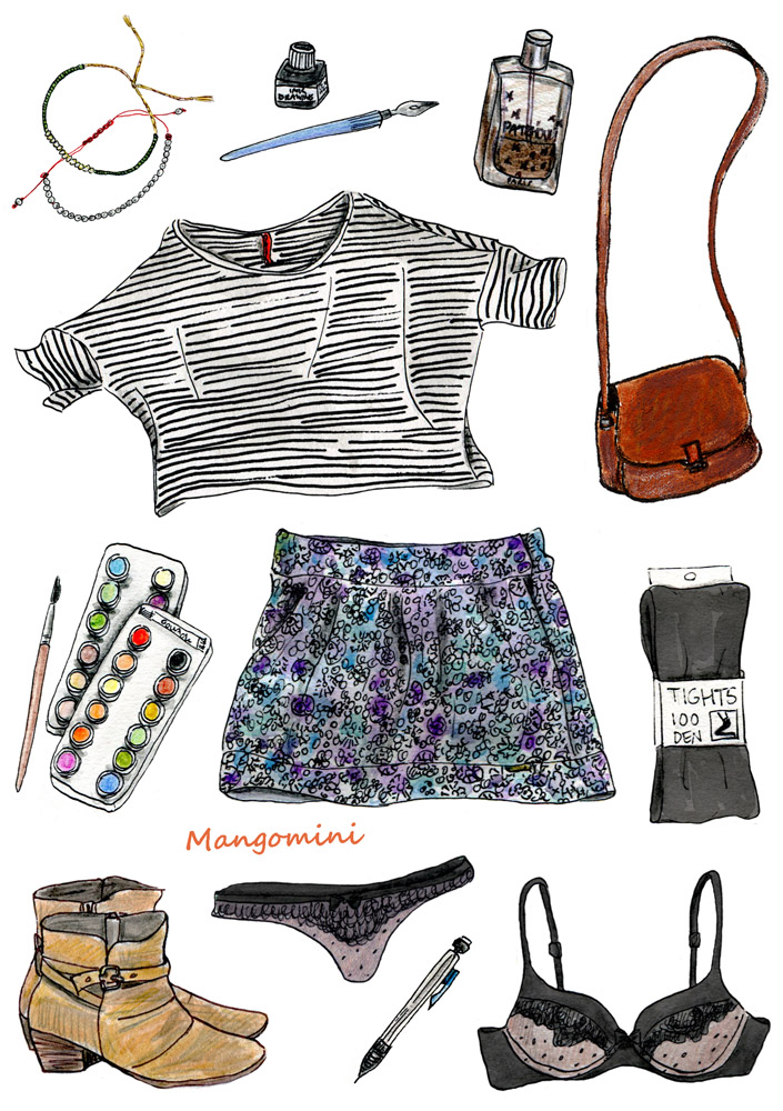 Wearing: Jewel Rocks green bracelet – red bracelet from Zzaval on Etsy – striped top, H&M – leather bag, vintage – skirt, Nümph – tights, H&M – ankle boots, Invito – underwear, Hünkemoller.