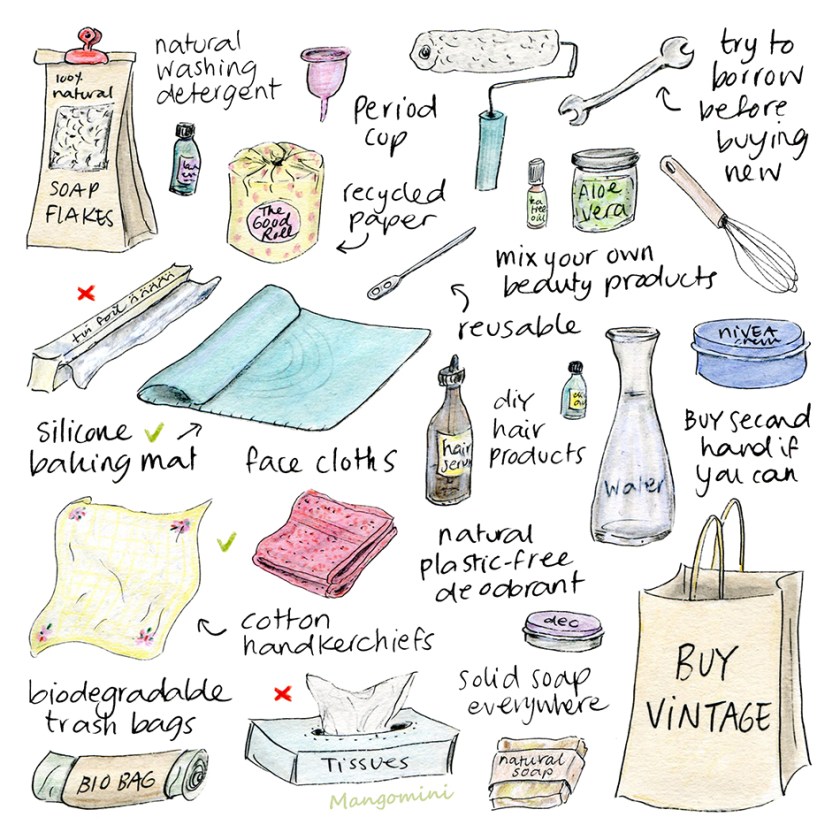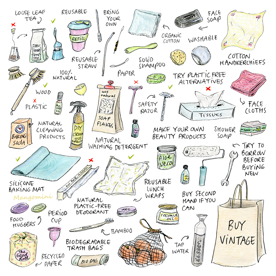 Today is World Environment Day. The perfect day to share part 3 of my personal journey to a “low waste’ life. These are the changes that I have personally made. I completely understand that not every option is available to everyone. But even if you can only make a few of these changes, you can make a difference. And if everyone tries a little bit, together we can accomplish a lot! If you find these drawings useful, I have it available on a postcard on Etsy, to keep as positive inspiration. You can also follow me on Instagram for more regular updates on my low waste journey.
