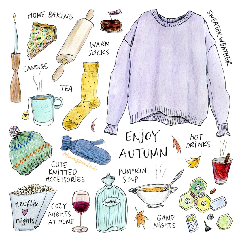Happy first day of autumn! (On the northern hemisphere). I love autumn (or fall, depending on where you live)! It’s the cosiest season (in my opinion). I look forward to long walks followed by hot drinks (mulled wine season!), dinner parties, game nights and reading under a warm blanket (to name a few). I tried to include all my favorite things about autumn in this drawing. What are your plans for fall?