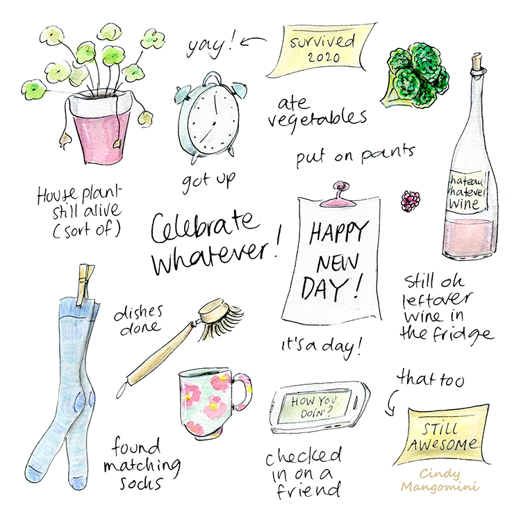 The Holidays are over but there’s no reason to stop celebrating small things. It’s been a tough year and we should be kind to ourselves. You survived 2020: well done! Put on pants today? That’s awesome! Checked in on a friend? You deserve extra karma points for that! Feel like you didn’t do anything worth celebrating today? Remember you are still awesome and it’s okay and normal to feel bad sometimes! 💚 Hopefully this drawing can serve as a little positive reminder. It was one of my best nine for 2020 on Instagram, and I updated it a little bit for 2021.