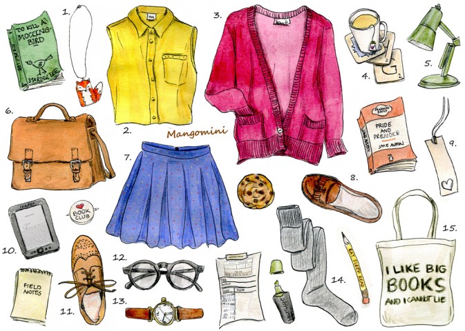 This week’s post for Hello Giggles was inspired by all girls who love books (I’m one of them) I’m currently reading three books at the same time. If you like this illustration, I have it available as a signed print (without the numbers) in my Etsy shop and as a postcard.