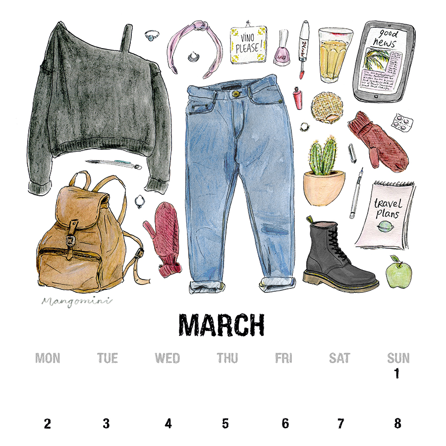 Hello March! A new month, as always, means a new calendar page. This is the illustration from the March page on my 2021 wall calendar. I went for cute and comfy knitwear layers, paired with my favorite blue mom jeans and red Dr. Martens boots. I also added tea, chocolate and plants for extra coziness. And since we’re still in lockdown and we have an evening clock between 21h and 4:30 there’s a lot of time for reading books, creative projects and watching Netflix.