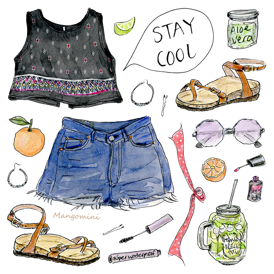 This is a drawing of my favorite heatwave outfit and essentials to keep me cool. If you like this you can follow me on Instagram and Pinterest for regular updates or shop my illustrated postcards and other papergoods on Etsy.high