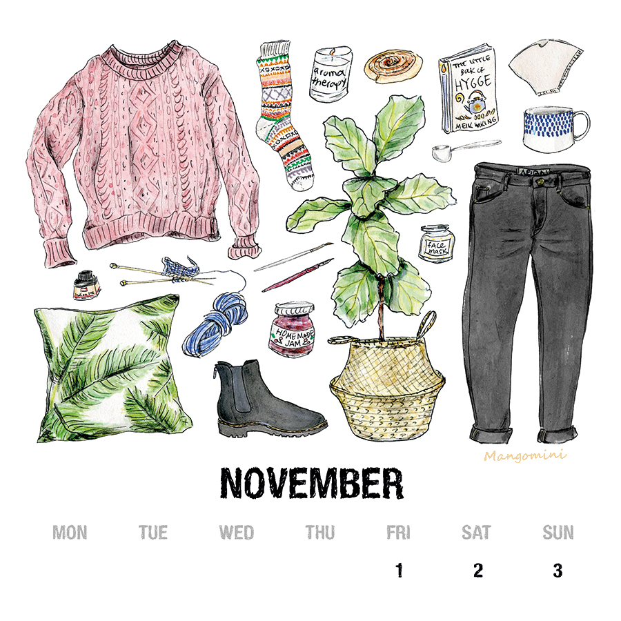 This is the November page from my 2023 wall calendar. The theme of this illustration is making it cozy at home, as you will usually spend more time indoors at this time of the year.